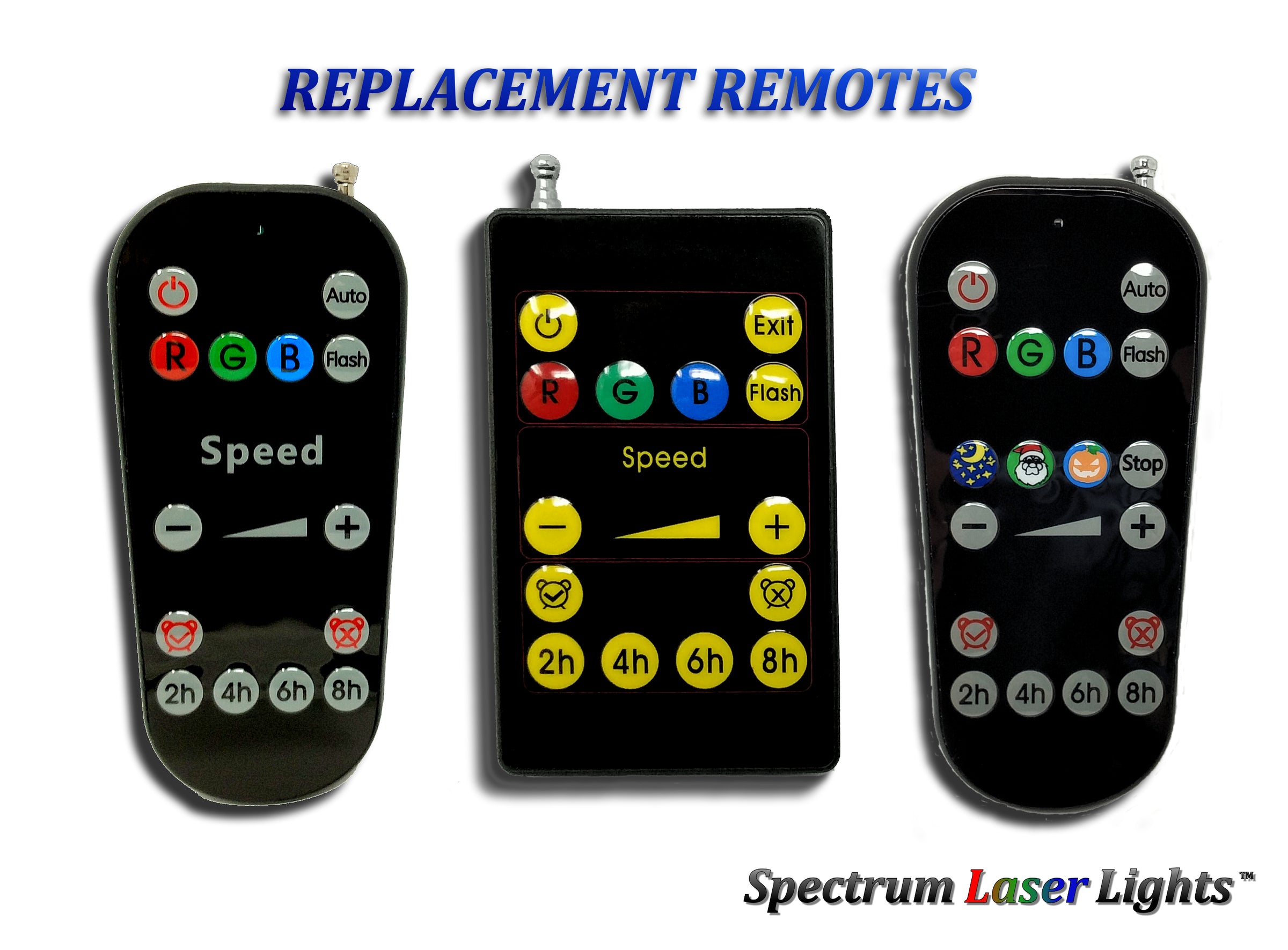 Our universal replacement remotes works with ALL of our laser light models (Radio Frequency and IR)
